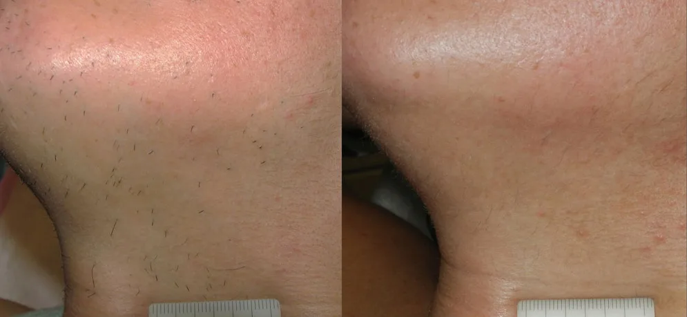 Der Diodenlaser hat keinen Streuverlust, da das kohärente Licht parallel verläuft und bis zu 8mm tief in die Haut eindringt, wo sich die Haarwurzeln befinden. Das Licht ist wesentlich stärker und bewirkt, dass das Haar einschliesslich Haarfollikel endgültig zerstört und erneutes Wachstum dauerhaft verhindert wird. Die Erfolgschancen liegen bei 95%.